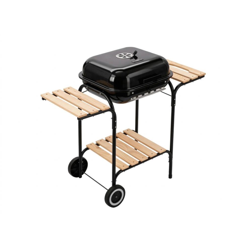 Gril disponuje priestrannou plochou na pečenie, ktorú uzatvára robustné veko vybavené ventilačným otvorom. Vďaka veku teplo rovnomerne cirkuluje, čím mäso zostáva šťavnaté a pokrmy sa upečú rýchlejšie a dôkladnejšie. Dve bočné a jedna spodná drevená polica poskytujú dostatok miesta na prípravu, korenie a hotové jedlá, takže počas grilovania budete mať všetko na dosah ruky.