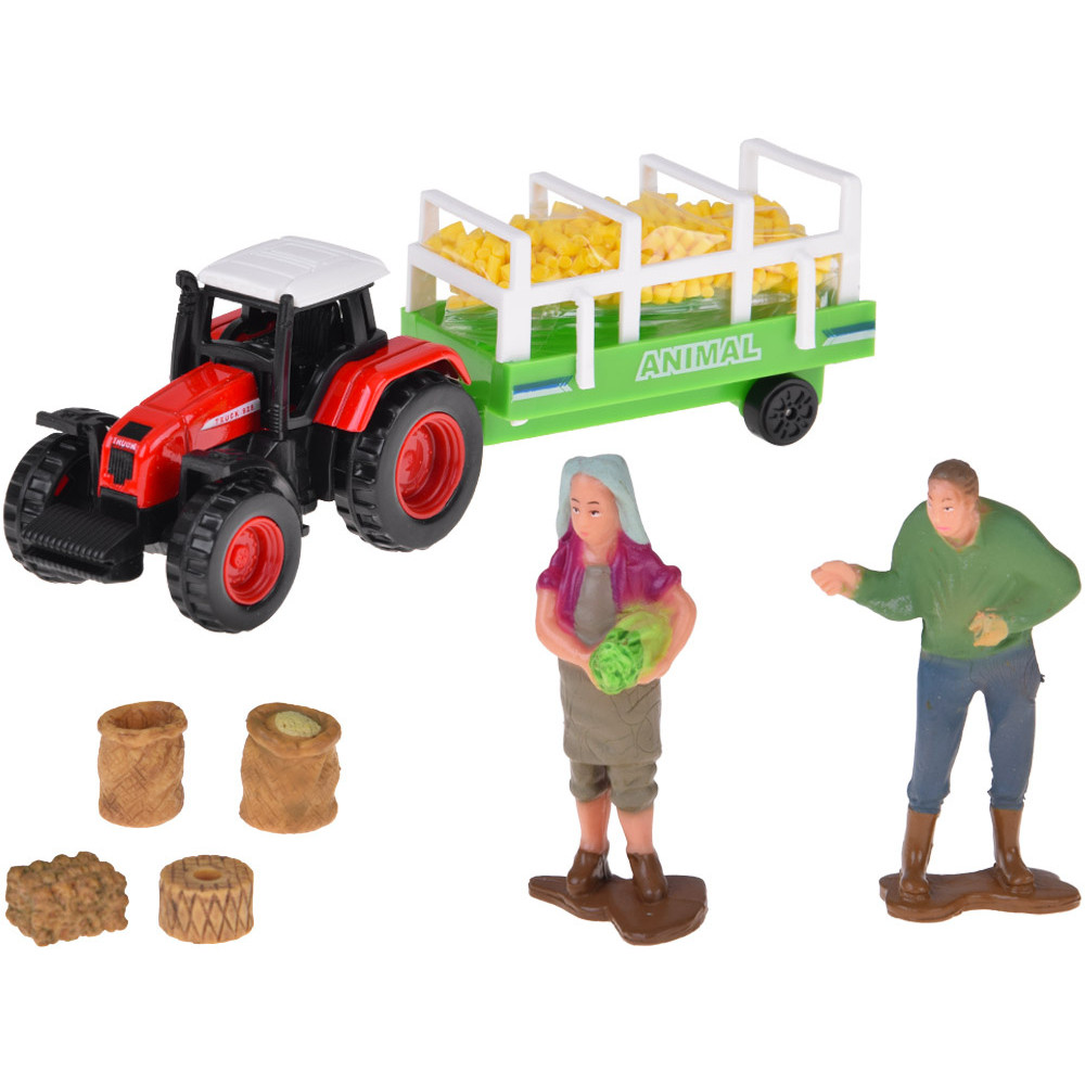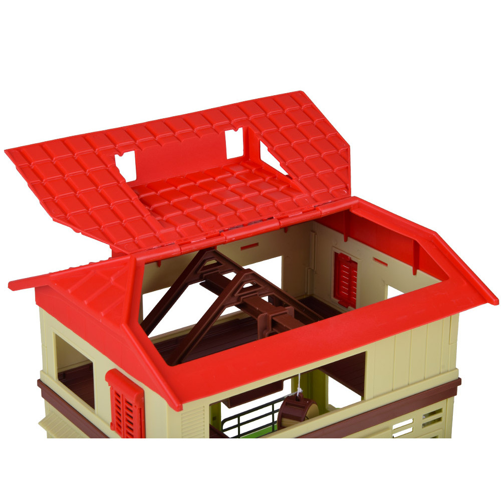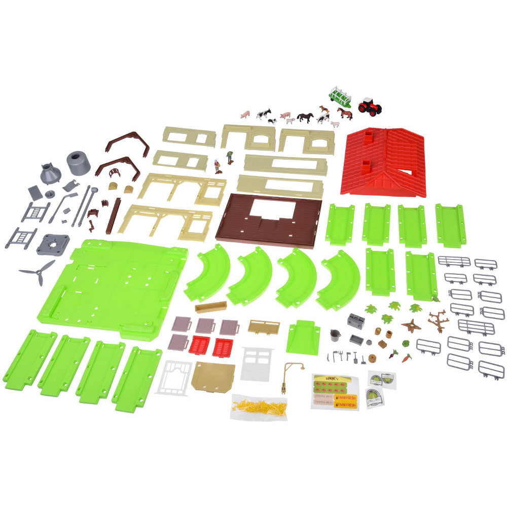 Budova stodoly s červenou strechou slúži ako sklad krmiva. Strecha sa otvára a špeciálna pohyblivá kľuka umožňuje jednoduché zdvíhanie a spúšťanie prvkov, čo prispieva k realistickému pocitu z hry. Obilné silo s praktickou funkciou na sypanie a vysypanie krmiva, aby deti mohli realistickým spôsobom kŕmiť zvieratá. Doplnkové prvky scenérie, ako napríklad veterný mlyn, lampáš, strom a plot pomáhajú vytvoriť skutočnú farmársku atmosféru. Traktor s prívesom je potrebný na prepravu krmiva, náradia alebo zvierat. Figúrky hospodárskych zvierat vrátane ošípaných, kráv, koní, oviec, baranov a psov vám umožňujú hrať rôzne príbehy súvisiace so starostlivosťou o zvieratá. Figúrky farmárov spestrujú zábavu a umožňujú hranie rolí. Obsahom balenia je náradie a príslušenstvo, ako lopata, vidly, sekera, motyka, vedro, debna, nádoby, zelenina a seno, vďaka nim si deti môžu vyskúšať každodenné povinnosti farmára. Zelená dráha dopĺňa celú zostavu a umožňuje rôzne herné aranžmány.