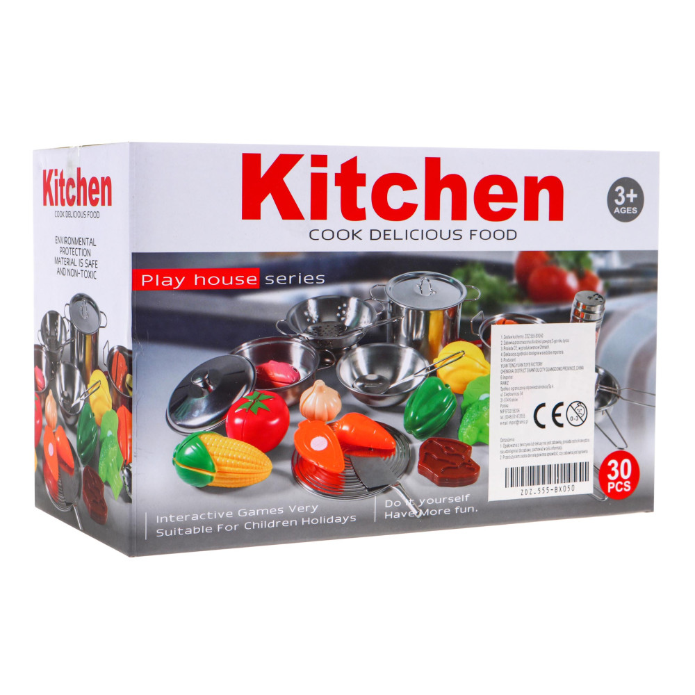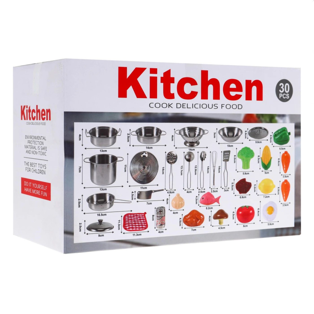 Každá malá kuchárka chce mať vlastné nádoby, aby mohla svojim bábikám pripraviť výborné jedlo alebo desiatu na piknik. Detský kuchynský riad zaručene spôsobí veľa radosti, vaša dcérka sa bude cítiť dospelo a dôležito. Ponúkame túto úžasnú 30-dielnu kuchynskú súpravu, ktorá pozostáva z hrncov a kuchynských doplnkov, ktorým budú môcť malé kuchárky pripraviť chutné jedlo pre svoje bábiky a plyšové hračky. Pri hre si rozvíjajú predstavivosť a zručnosť a zároveň zažijú veľa hodín skvelej zábavy. Sada riadu je vyrobená z kovu a dôrazom na najmenšie detaily, potraviny sú vyrobené z kvalitného a odolného plastu. Tento krásny set je výborným darčekom na akúkoľvek príležitosť.