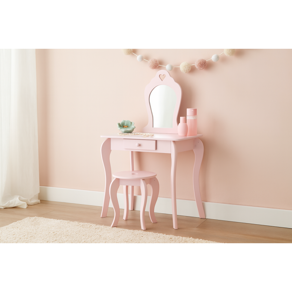 Tento očarujúci toaletný stolík je snom každého malého dievčatka, ktoré sa rado parádi. Poskytuje ideálne miesto na česanie vlasov, skúšanie prvých sponiek či hru na salón krásy. Jemný a prepracovaný dizajn sa harmonicky hodí do každej detskej izby a podporuje kreativitu a hru. Bezpečné materiály zaručujú, že stolík je odolný a vhodný pre každodenné používanie, pričom každý detail je navrhnutý s ohľadom na pohodlie a bezpečnosť vášho dieťaťa.
