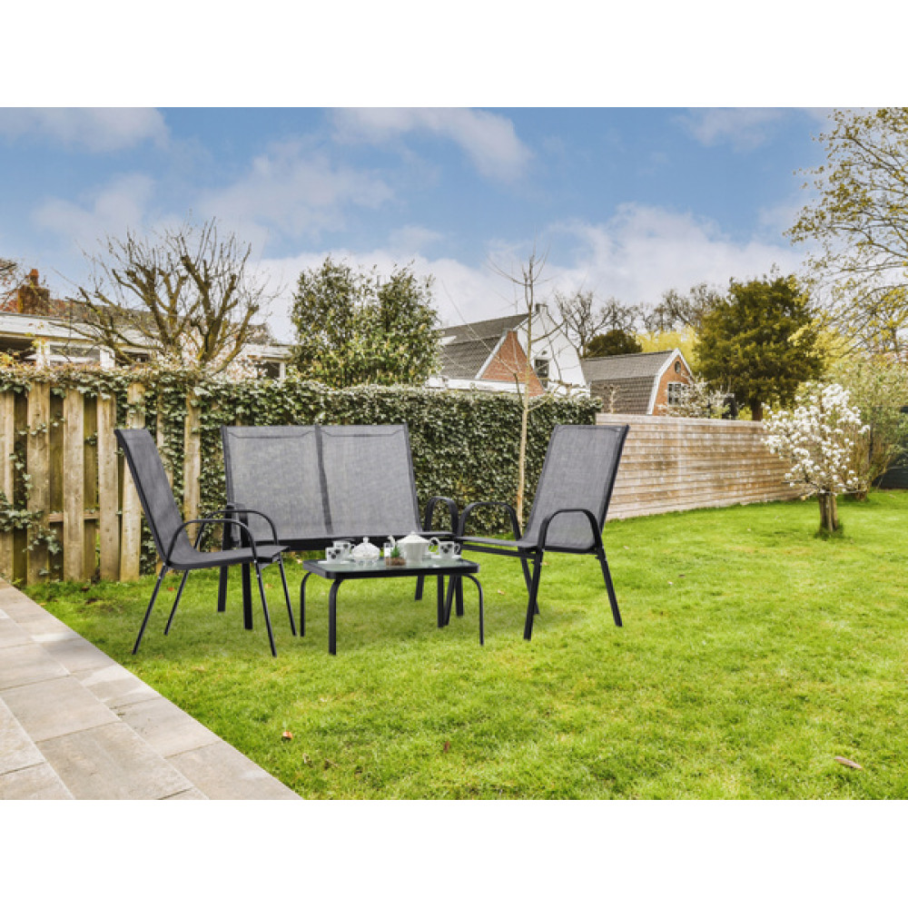 Konštrukcia nábytku je vyrobená z kvalitnej ocele s práškovou povrchovou úpravou v elegantnej šedo-čiernej farbe, ktorá zabezpečuje vysokú odolnosť voči poveternostným podmienkam a dlhú životnosť. Sedacie plochy a operadlá sú potiahnuté odolným materiálom Textilene 2×1, ktorý je priedušný, pevný a poskytuje maximálne pohodlie aj počas horúcich letných dní.