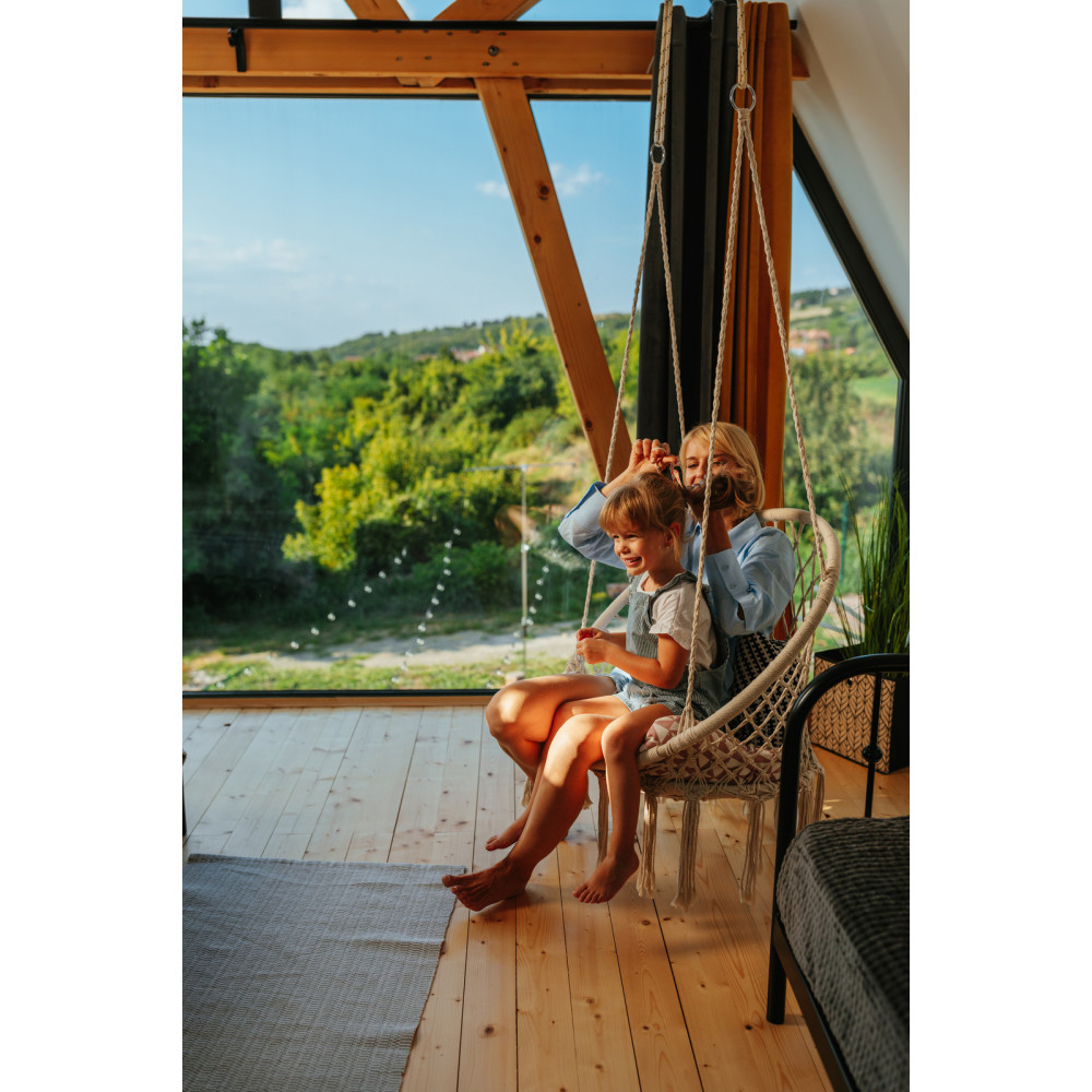 - Všestranné umiestnenie: Možno ho upevniť v jednom alebo dvoch bodoch (na strop, trám alebo stojan), takže sa dá použiť ako klasická hojdačka alebo ako kreslo otočné o 360 stupňov.