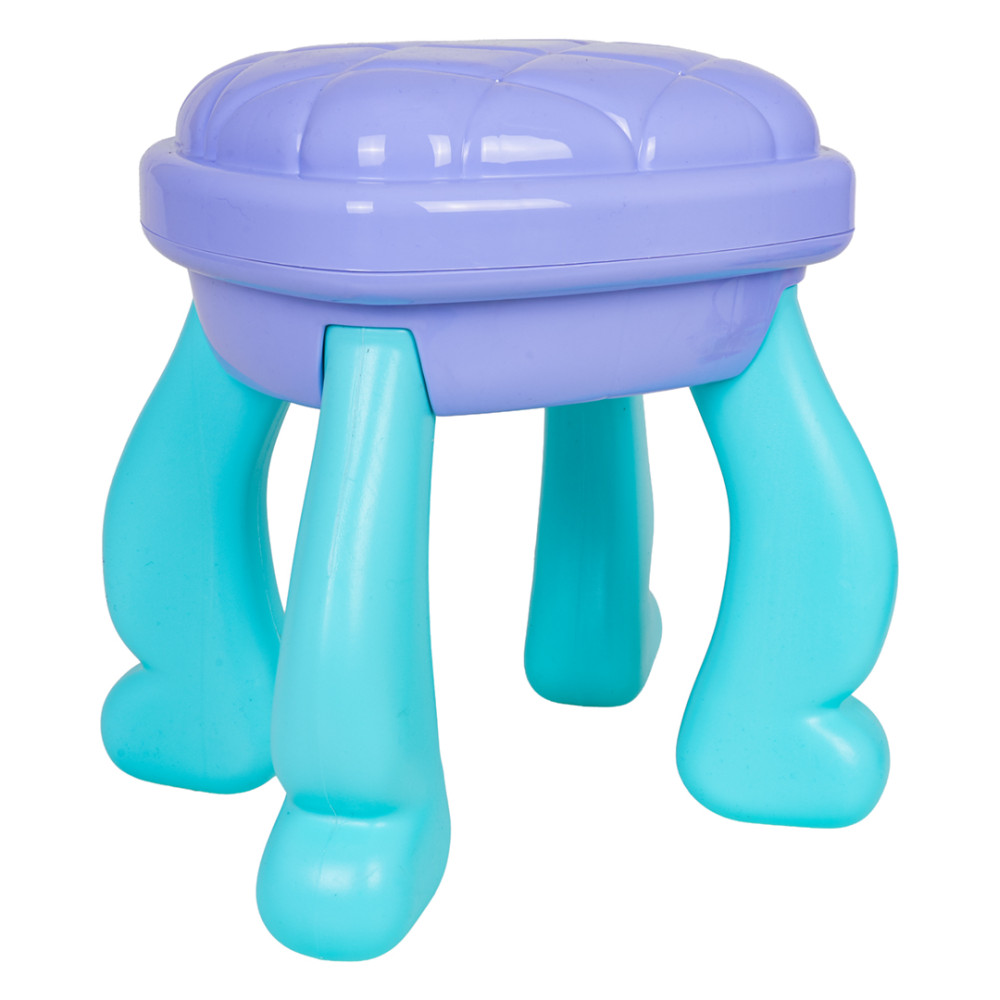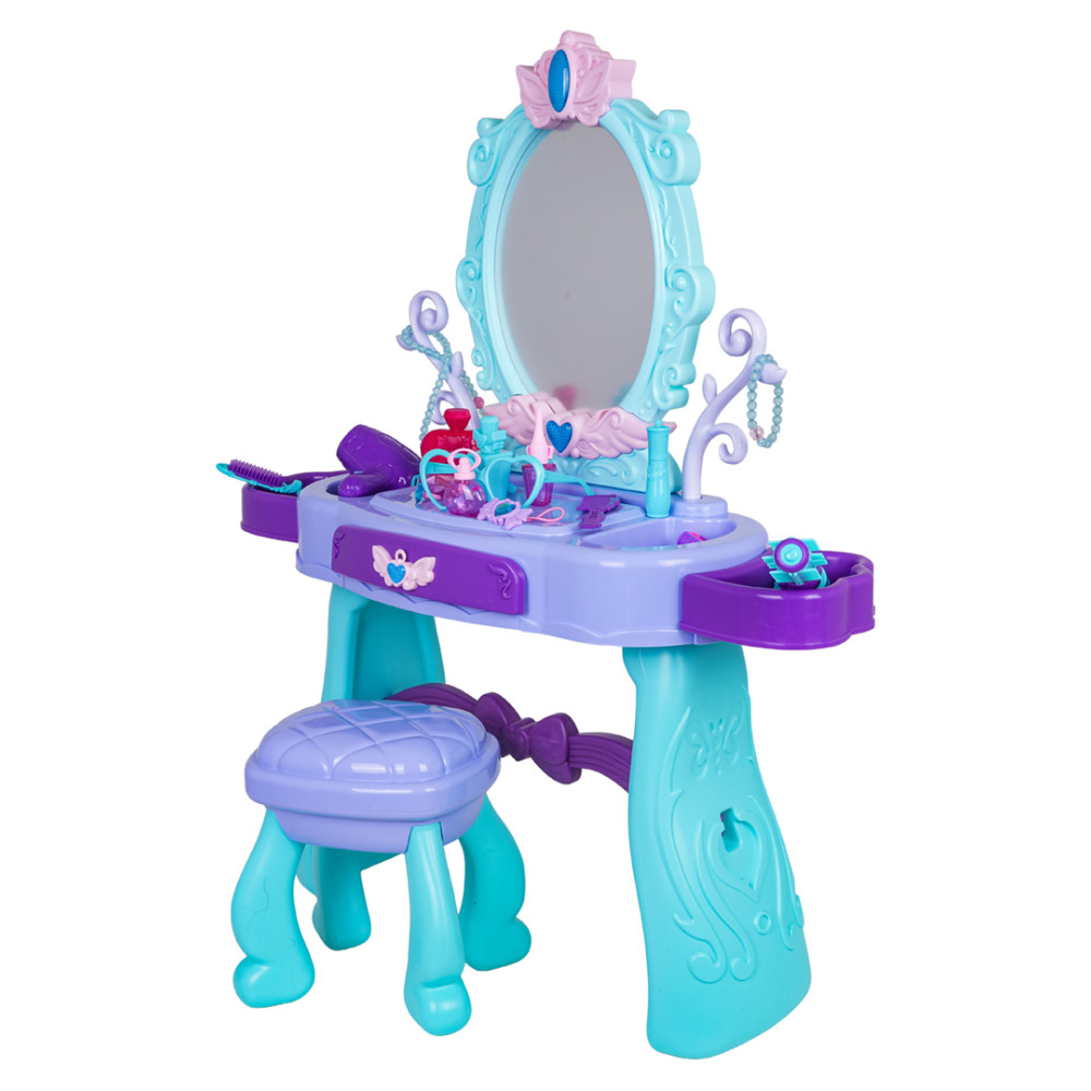 Magický toaletný stolík so stoličkou a doplnkami je určený pre deti od 3 rokov. Súprava je vyrobená s dôrazom na detail a v žiarivých farbách. Toaletný stolík má krásne zdobené zrkadlo, otváraciu zásuvku a bočné police na doplnky. Súprava obsahuje fén, kulmu so žehličkou na vlasy, skladaciu kefu, hrebeň, okuliare, otváracie nádobky na kozmetiku, imitáciu rúžu a laku na nechty, ako aj náramok, korálky, sponky do vlasov a prsteň. Osvetlenie zrkadla na toaletnom stolíku je napájané batériami.