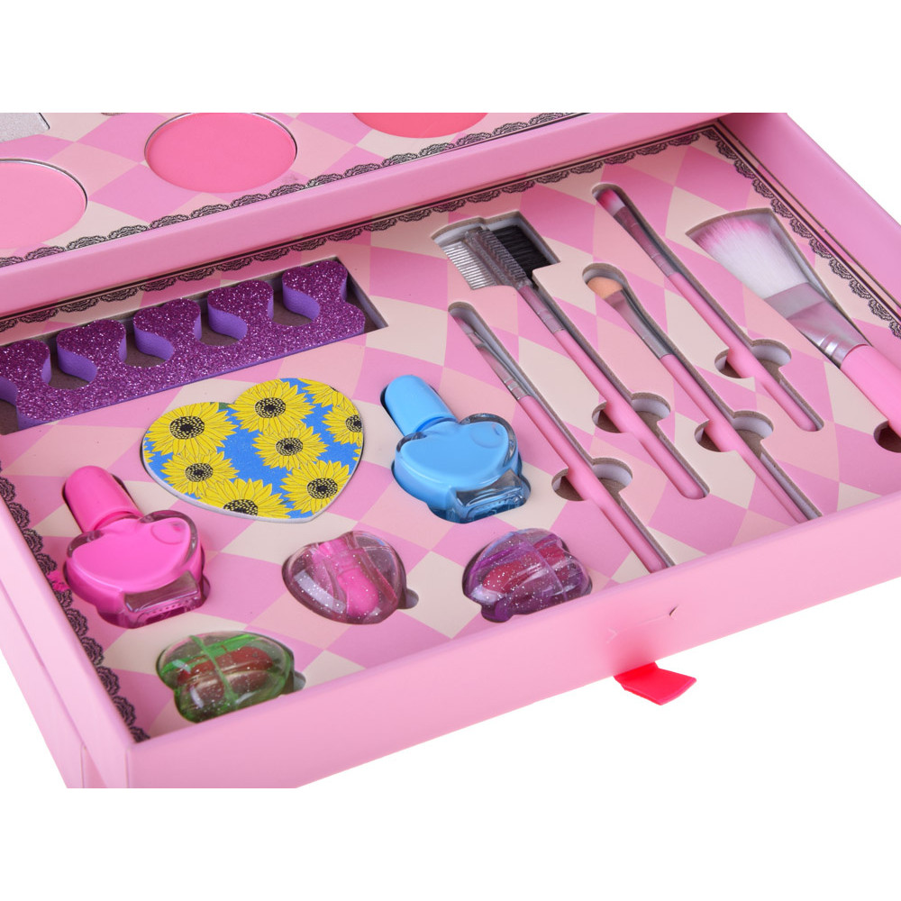 Krabica je rozdelená do troch úrovní, takže každá časť má svoje vlastné špeciálne miesto. Prvá úroveň predstavuje obrovský výber tieňov, líceniek a trblietok, ktoré vám umožnia vytvoriť farebné líčenie plné fantázie. Prvá zásuvka obsahuje sadu štetcov a príslušenstva na zdobenie nechtov – laky na nechty, separátor a pilník v tvare srdca, vďaka ktorému sa malá stylistka bude cítiť ako v skutočnom kozmetickom salóne. Druhou zásuvkou je kráľovstvo šperkov a vlasových doplnkov – farebné vlasové gumičky, sponky, prstene a náramky v tvare srdiečok, kvetov, motýľov alebo sladkých koláčikov.