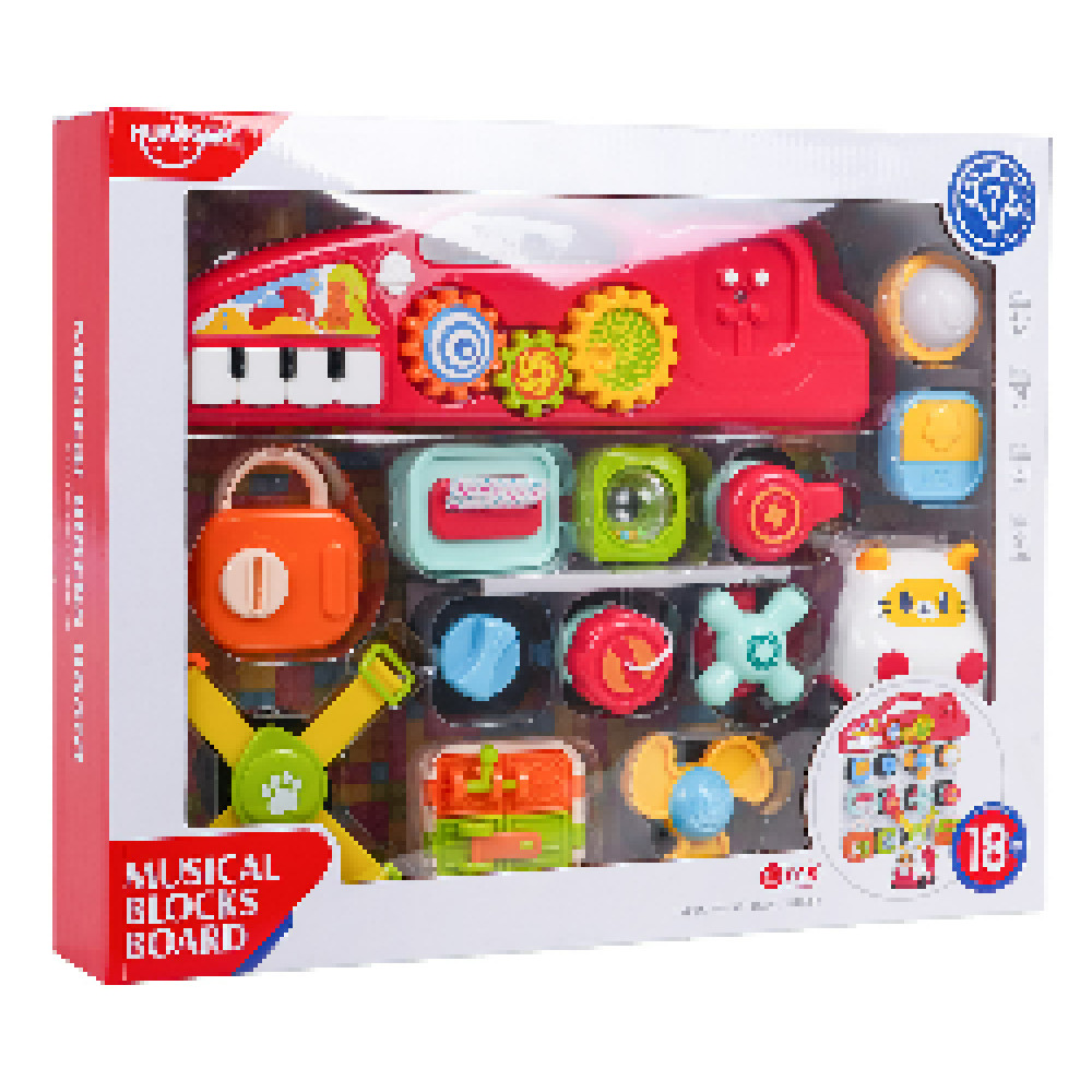 Multifunkčná hracia doska so zvukovými a svetelnými efektmi je vhodná pre deti od 18 mesiacov. Sada je vyrobená z vysoko kvalitných materiálov v žiarivých farbách. Hracia doska má tvar domčeka s červenou strechou a na vrchu sa nachádza praktické držadlo na prenášanie. Pod ňou sa nachádza klávesnica s hudobnými zvukmi, ozubené kolesá na otáčanie a miesto na pripevnenie 2 interaktívnych prvkov. Biela časť domu slúži ako základňa na pripevnenie kociek, ale nejde o bežné kocky; každá má inú funkciu. Sú tam kocky na otáčanie, s rozmetadlom na otáčanie, s kľúčom na otváranie, so zámkami, kohútikom, vysúvacím prvkom a ďalšie. Sada obsahuje aj auto s kockami, ktoré sa dajú pripevniť na boky a vrch. Táto hračka rozvíja jemnú motoriku a koordináciu ruka-oko. Sada je napájaná batériami.