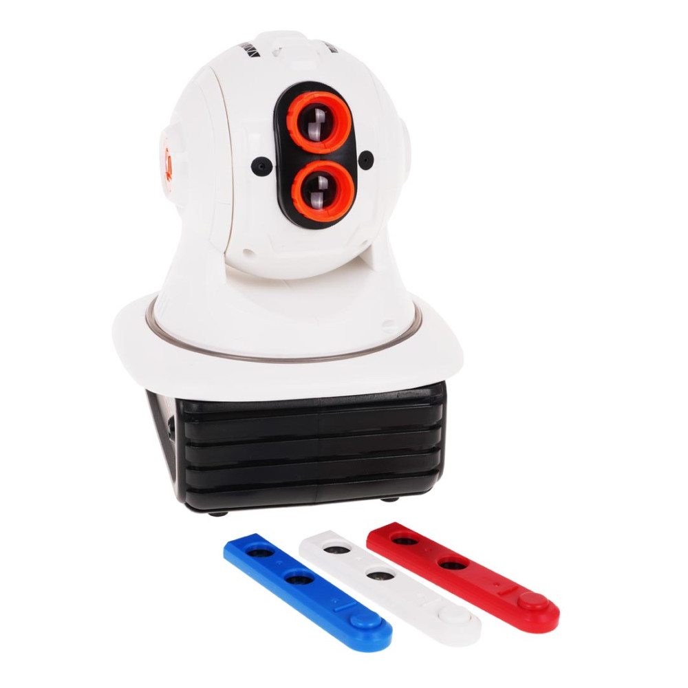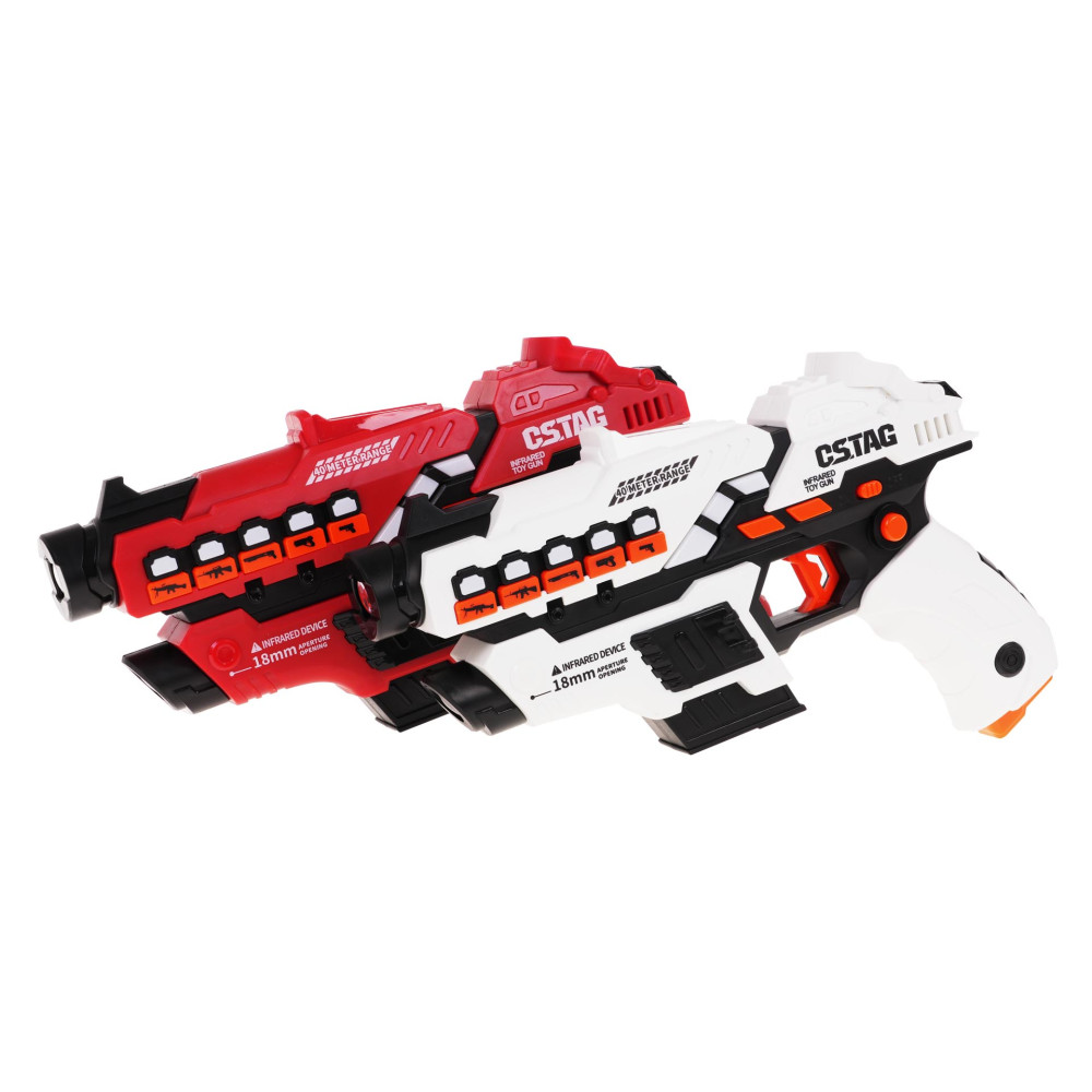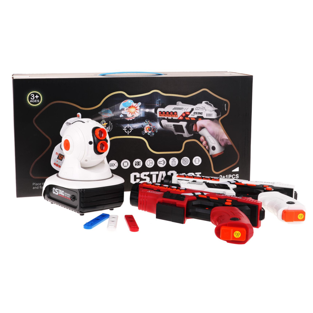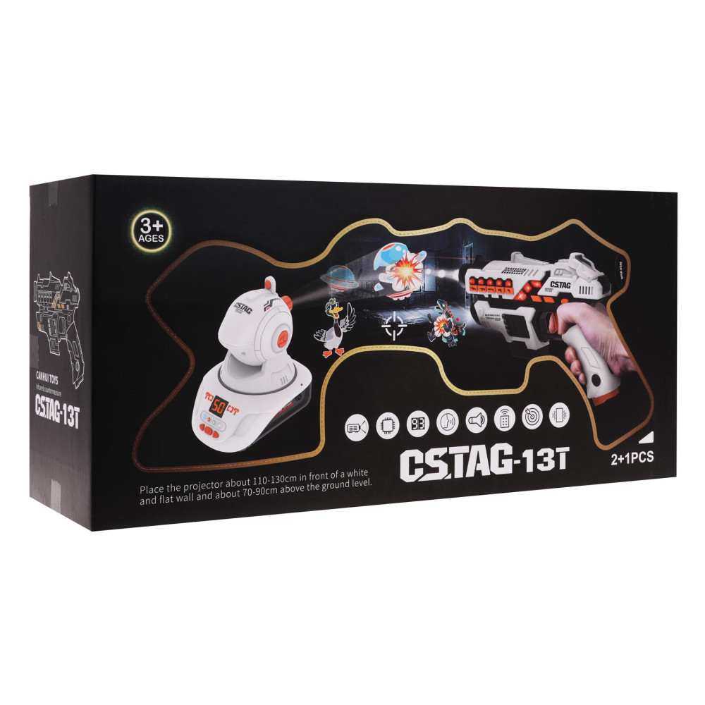 Sada laserových pištolí s projektorom je určený pre deti od 3 rokov. Sada obsahuje 2 laserové zbrane a projektor. S touto sadou môžete strieľať jeden na druhého alebo na obrazy generované projektorom. Môžete si vybrať z 5 režimov streľby a môžete zostaviť 2 až 4 tímy. Zbrane fungujú na infračervenom svetle; infračervený signál použitý v tejto sade je bezpečný pre deti a nespôsobuje poškodenie očí. Každá zbraň má počítadlo životov; po každom úspešnom výstrele a zasiahnutí súpera zbraň pípne a zavibruje. Vibrácie a zvuky streľby poskytujú neuveriteľný zážitok pre každého používateľa. Keď sa zásoba „životov“ vyčerpá, svetlá na zbraniach zhasnú. Zbrane sú ľahké a ľahko sa držia. Dosah boja by nemal presiahnuť 40 metrov. Zbrane a projektor sú napájané batériami.