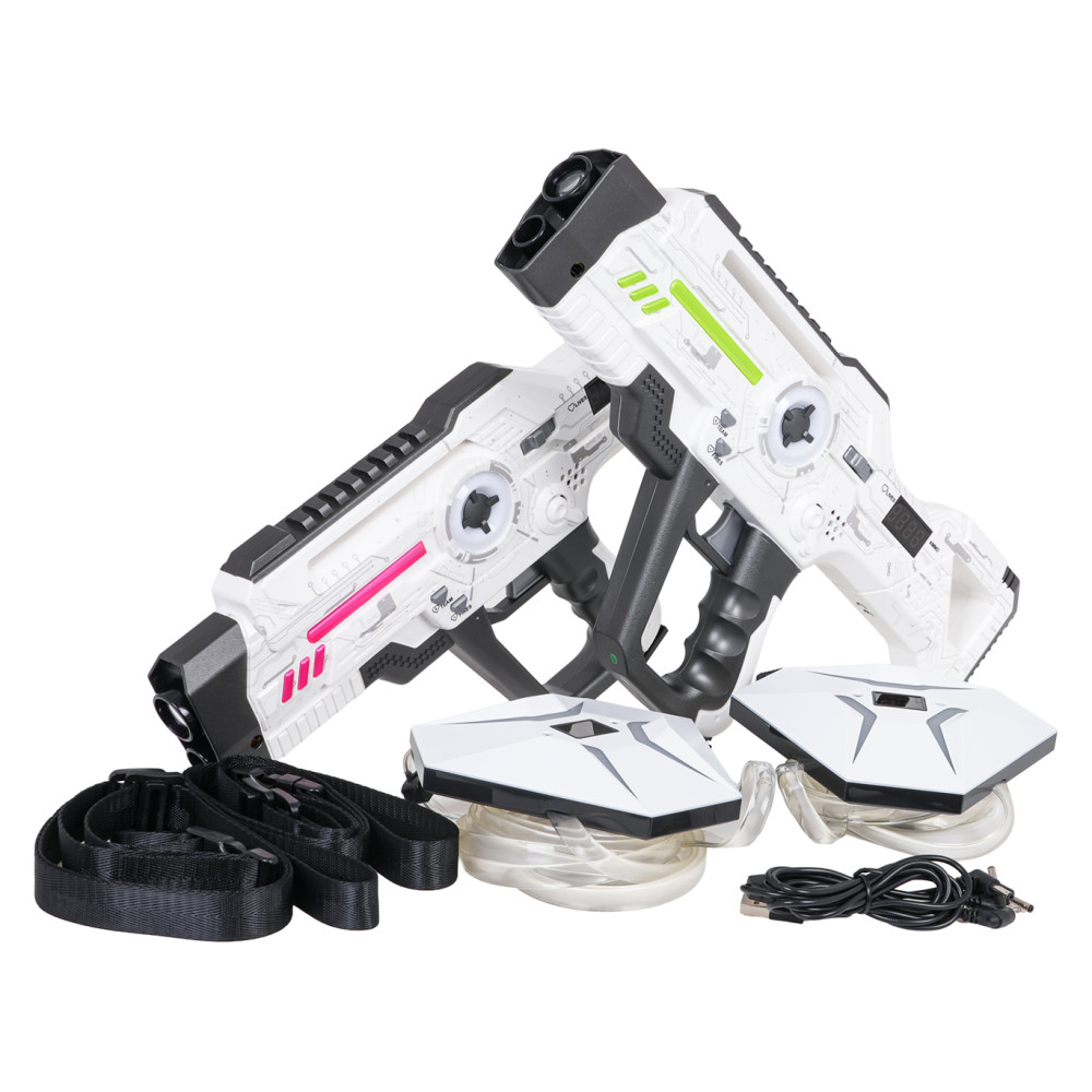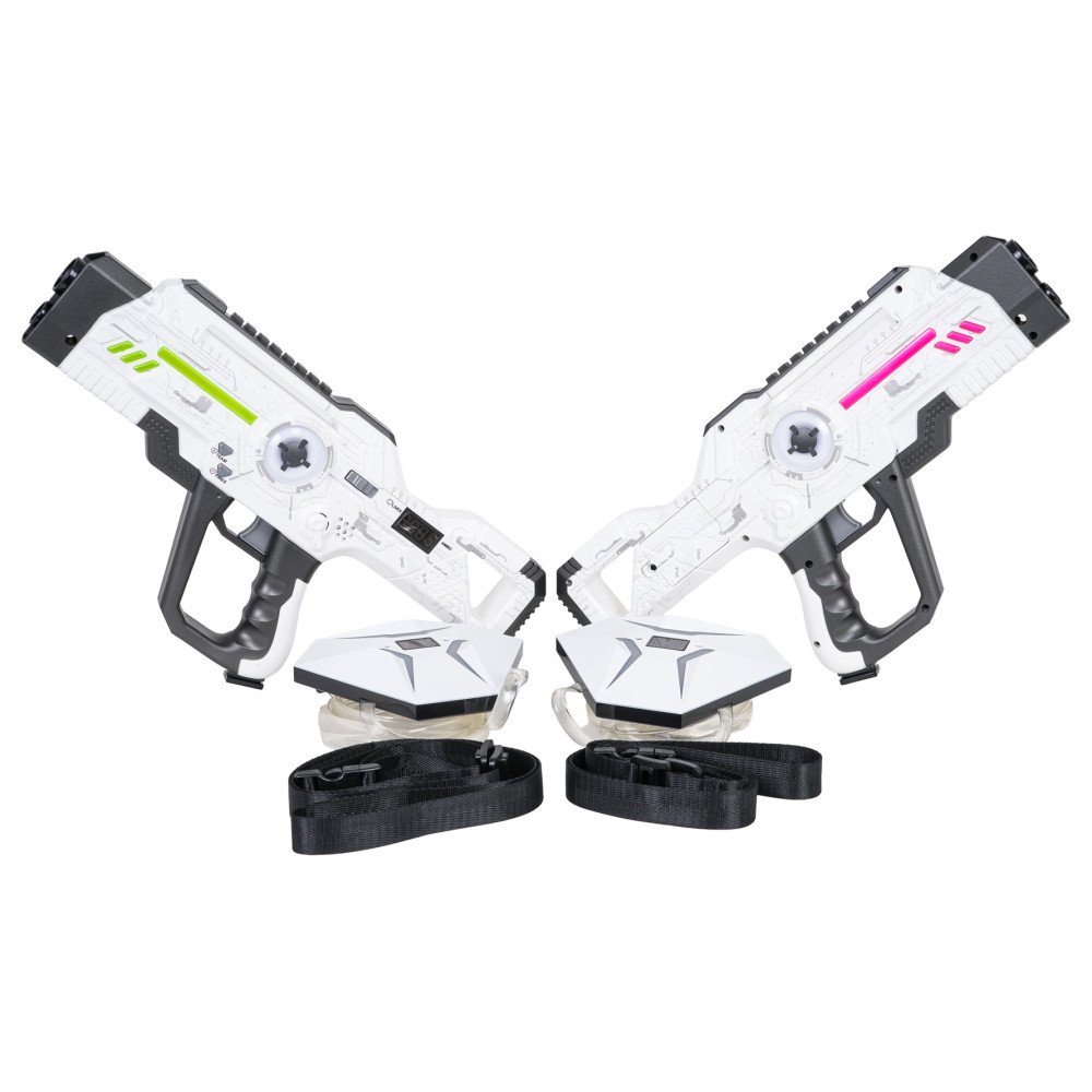 Sada 2 laserových pištolí a 2 viest je vhodná pre deti od 8 rokov. Táto sada zaručuje zábavu a vstavané batérie vo vestách a pištoliach zabezpečujú dlhotrvajúcu hru. LED displej vám umožňuje sledovať vaše zdravie a úroveň munície. Pred začatím hry si nastavte hodnoty zdravia (1-99) a munície (1-12). Začiatočníci si môžu nastaviť maximálnu hodnotu, zatiaľ čo pokročilí hráči si môžu nastaviť nižšiu hodnotu, aby zabezpečili konzistentný herný zážitok. Taktiež si musíte zvoliť farbu tímu pre zbraň a vestu. Hry sa môžu zúčastniť až 4 tímy: oranžová, modrá, červená a zelená. Popruhy vesty sú nastaviteľné a osvetlené pre viditeľnosť v tme. Pre ešte vzrušujúcejšiu hru si môžete prepínať medzi jedinečnými schopnosťami: jednorazová streľba, laserová puška, guľomet a plazmová puška. Dostrel je až 60 metrov (v tme). Sada sa dodáva s 8 batériami, ktoré vydržia 6 hodín pre pištoľ a až 3 hodiny pre vestu. Sada obsahuje štvorkolíkový USB nabíjací kábel na nabíjanie všetkých vašich zariadení naraz.