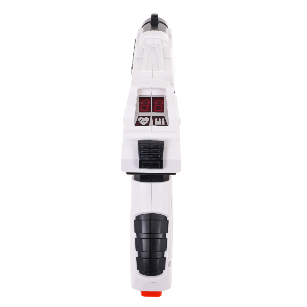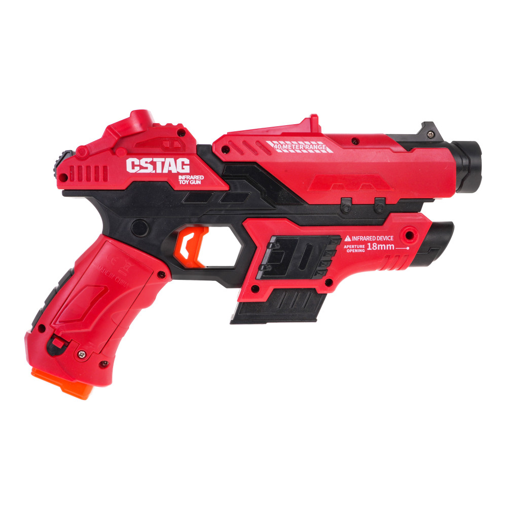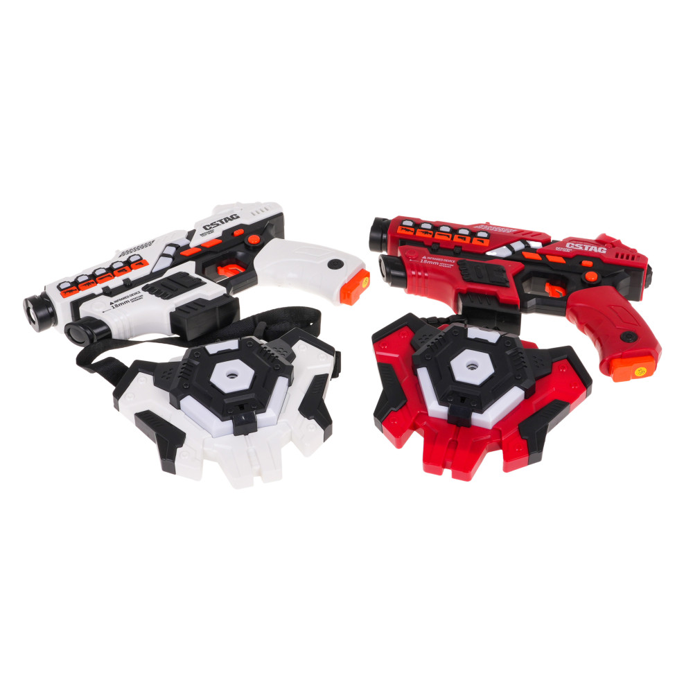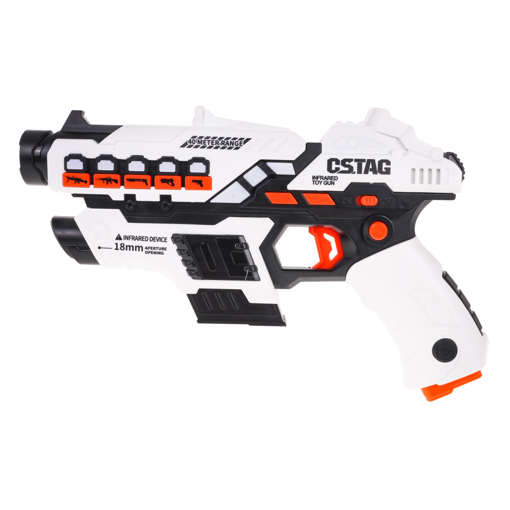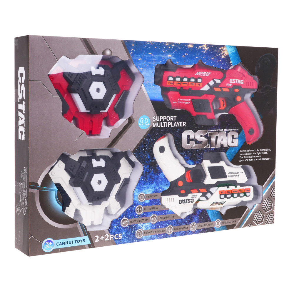Táto sada laserovej zbrane a terča s funkciou dymu je ideálna pre deti od 3 rokov. Sada obsahuje 2 laserové zbrane a 2 terče. K dispozícii je 5 režimov streľby, ktoré umožňujú použitie 2 až 4 tímov. Zbrane a terče fungujú pomocou infračerveného svetla; infračervený signál použitý v tejto sade je bezpečný pre deti a nespôsobuje poškodenie očí. Každá zbraň má počítadlo životov; po každom úspešnom výstrele a zásahu zbraň a vesta pípnu a zavibrujú. Vibrácie a zvuky streľby poskytujú pohlcujúci zážitok pre každého používateľa. Keď sa zásoba životov vyčerpá, svetlá zbrane zhasnú a z terča sa začne valiť dym/vodnú paru (najprv nezabudnite terč naplniť vyčistenou vodou). Zbrane sú ľahké a ľahko sa držia. Dosah boja by nemal presiahnuť 40 metrov. Zbrane a vesty sú napájané batériami.