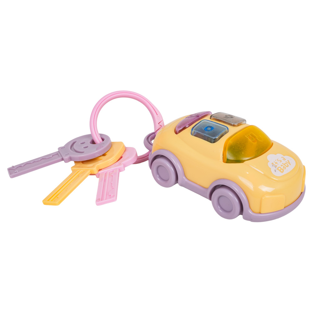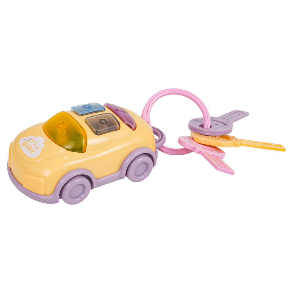 Interaktívna sada kľúčenky a kľúčov v tvare vozidla je vhodná pre deti od 18 mesiacov. Hračka je vyrobená z materiálov bezpečných pre bábätká a nemá ostré hrany. Tlačidlá na streche auta aktivujú zvukové efekty: zvonček, zvuk štartovania, zvuk odomykania auta a klaksón. Svetlá tiež blikajú. Hračka je napájaná batériami.