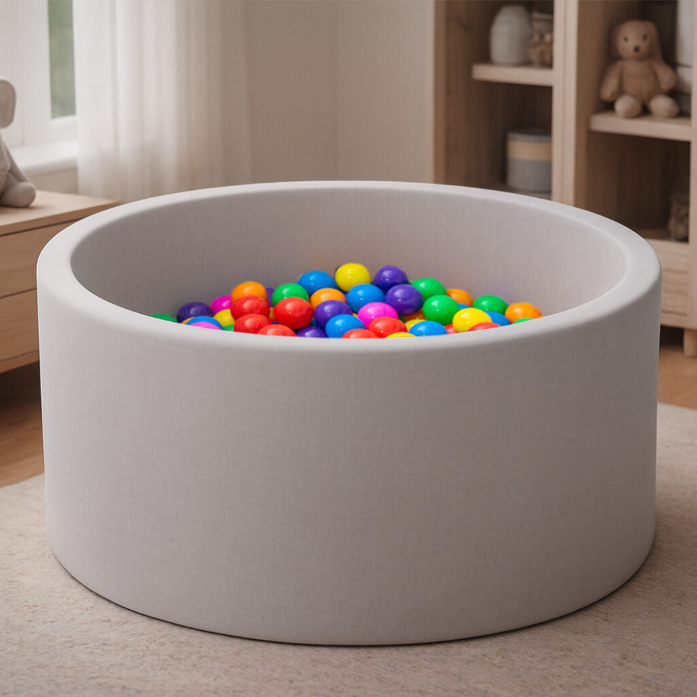 Máte doma dieťa, ktoré ani chvíľku neobsedí? Posaďte ho do tohto roztomilého bazénika, v ktorom sa dokáže skvele vyhrať a zabaviť. Steny bazénika sú vyplnené odolnou polyuretánovou penou, ktorá je potiahnutá látkou. V sade s bazénom je 200 farebných loptičiek (Ø 5,5 cm). Všetky použité materiály sú najvyššej kvality. Plastové guličky pre suchý bazén sú vyrobené z netoxického materiálu, bezpečné pre deti, veľmi flexibilné, nedeformovateľné, majú certifikát CE. Poťah bazénika je vďaka všitému zipsu odnímateľný a možno ho tak kedykoľvek zložiť a vyprať.
