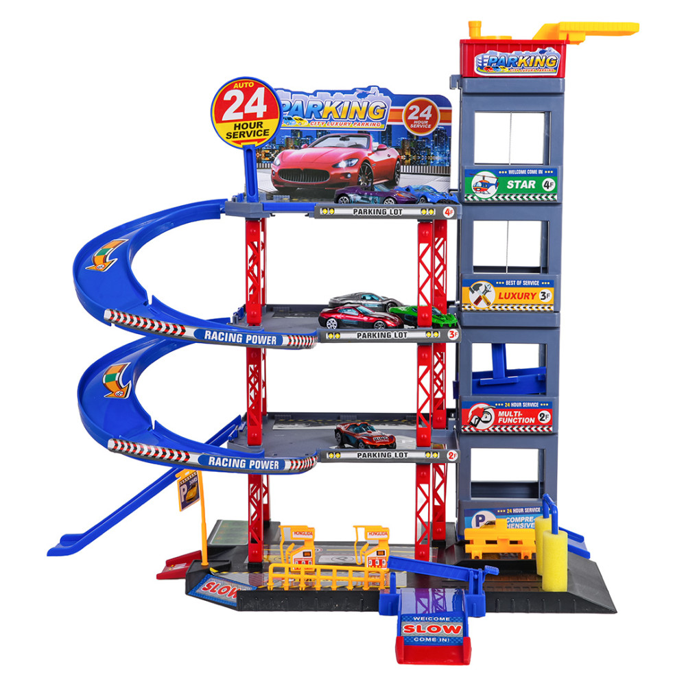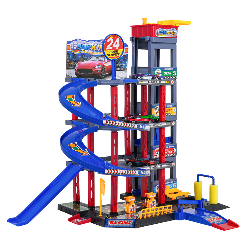 Veľké interaktívne parkovisko s výťahom, stanicou, šmykľavkami pre autá a hracou podložkou s cestami je ideálne pre deti od 3 rokov. Parkovisko má viacero úrovní, ktoré sú prístupné výťahom. Každé poschodie je prepojené s inou šmykľavkou pre autá. Viacposchodové parkovisko ponúka parkovacie miesta, čerpaciu stanicu, výťah pre autá, umývačku áut a pristávaciu plochu pre vrtuľníky. Výťah sa ovláda manuálne (kľukou). Súčasťou parkovacej súpravy je aj plstená hracia podložka s cestami a až 6 áut.