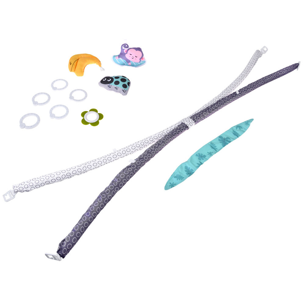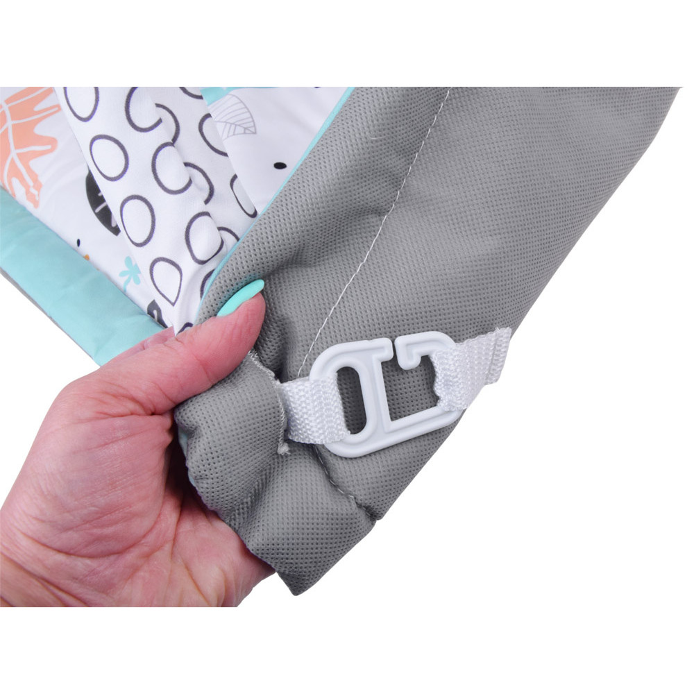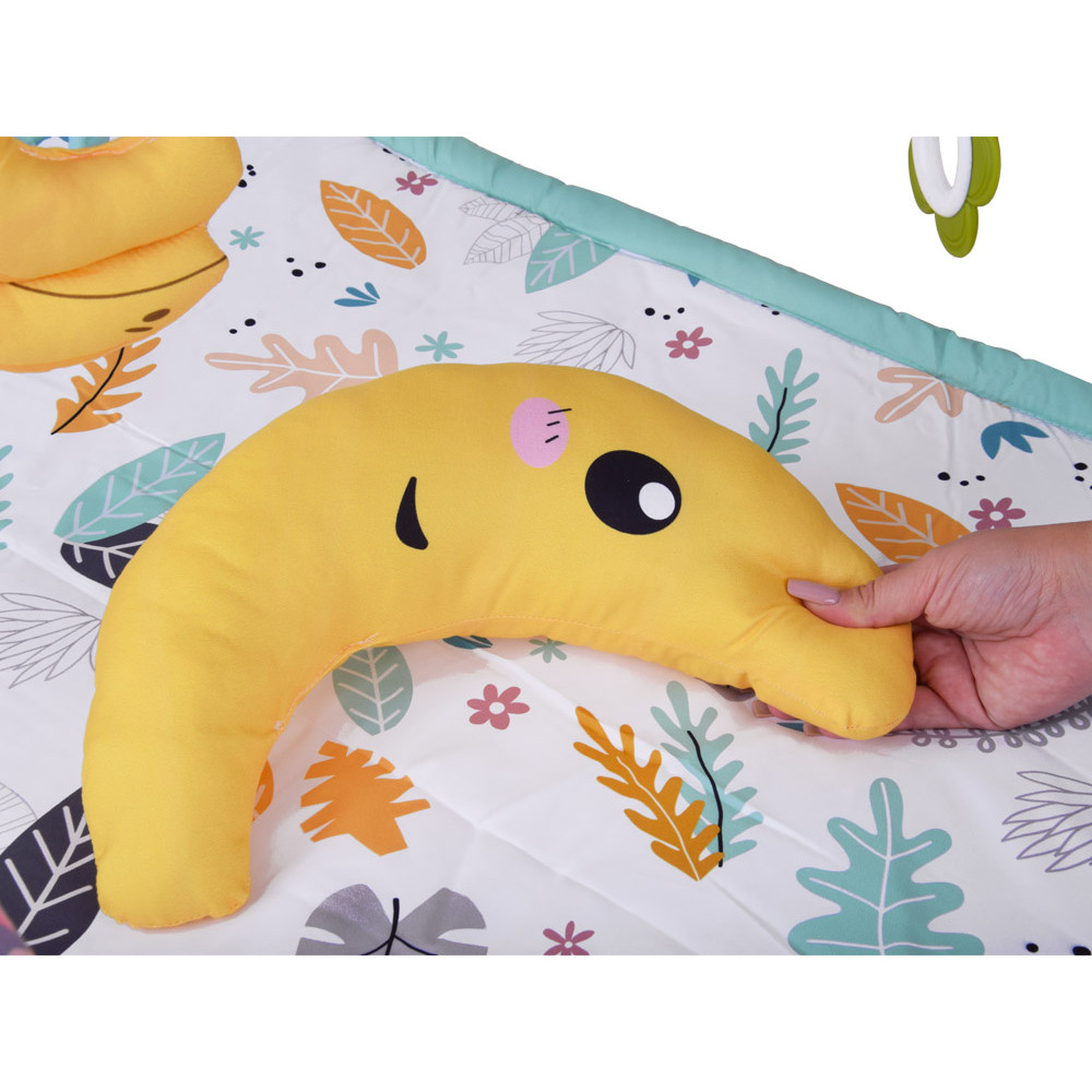 Táto vzdelávacia hracia podložka pre bábätká je ideálnym miestom pre vaše dieťatko na hranie, učenie a relax. Jej moderný dizajn a funkčnosť jej umožňujú rásť s vaším dieťaťom a podporovať jeho vývoj v každej fáze. Podložka je vybavená rôznymi multifunkčnými hračkami: šuštiace listy, mäkká opička s pískadlom vo vnútri, žlté látkové banány, roztomilá lienka so zvončekom vo vnútri, hryzátko, žltý croissant, mesiac ideálny na ležanie na brušku. Táto vzdelávacia podložka nie je len krásnou dekoráciou do detskej izby, ale predovšetkým praktickým doplnkom, ktorý podporuje vývoj vášho dieťaťa v každej fáze. Podložka povzbudzuje vaše dieťa k aktivite, rozvíja jemnú a hrubú motoriku a učí motorickú koordináciu. Rozmanitosť farieb, tvarov a textúr materiálov stimuluje predstavivosť a podporuje rozvoj zraku a hmatu. Mäkký povrch poskytuje pocit bezpečia a funkčné prvky umožňujú prispôsobiť podložku potrebám vášho dieťaťa.